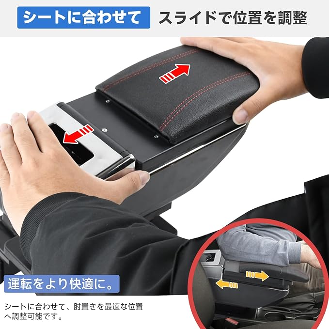 長時間の運転の疲れを軽減、センターコンソールの空きスペース有効活用のアームレストです。アームレストの長さを1段階調節でき、シートの位置によって使い分けができます。