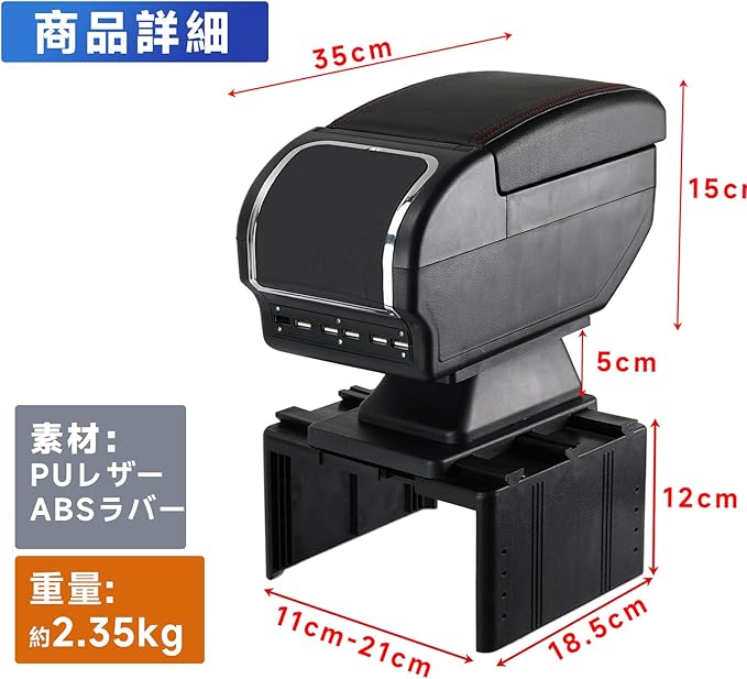 【商品内容】:アームレスト 車。アームレスト/USBケーブル/固定ネジ/台座。【本体サイズ】:35*15*14cm 【総サイズ】(約)35*15*32cm【高さ調整】:(約)27cm/32cm。【幅調整】:(約)11cm〜21cm。【重量】:(約)2.35kg。【素材】:ABS、PUレザー。