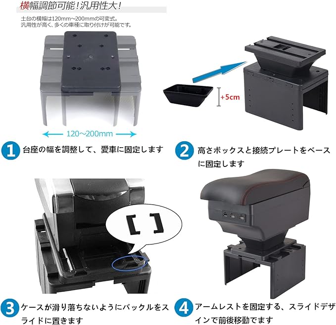 【車種汎用】運転席と助手席の間は12-21CM、アームレストがない車は装着できるんです。 このアームレスト収納ボックスは、土台の幅が可変するので様々なセンターコンソールの幅に合わせることができます。 また、センターコンソールがない車種でも、自作の台に取り付けたりと自由な設置が可能になります。固定方法は、説明書をご覧ください。