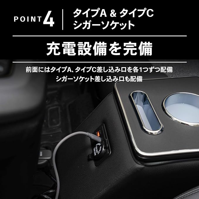 Point4 「充電設備を完備」 前面にはタイプA、タイプC差し込み口を各1つずつ配備 シガーソケット差し込み口も配備 Point5 「アームレスト機能も搭載」 アームレストがあるだけで運転の乗り心地が段違い変わります。