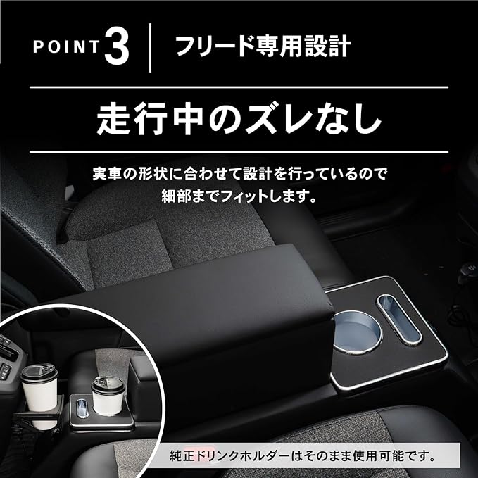 Point2 「ジャストフィット」 設置は座席の隙間に入れ込むだけ。 軽量のため、女性やお子様でも簡単に設置ができます。 Point3 「走行中のズレなし」 実車の形状に合わせて設計を行っているので 細部までフィットします。