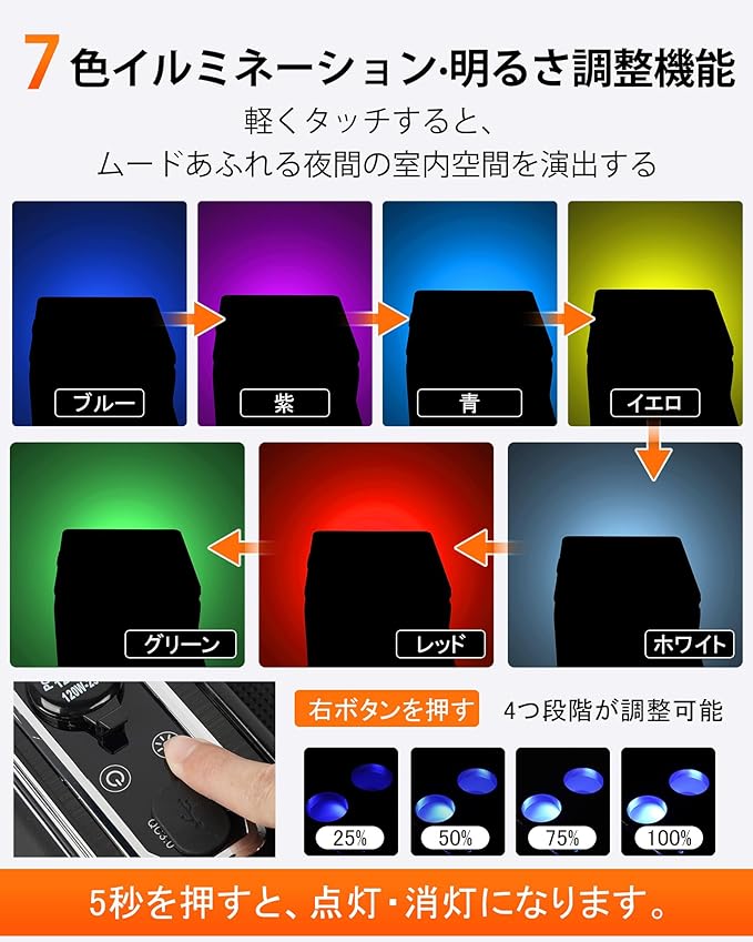 【7色LEDライト|4段階明るさ調整】7 色に自由に切り替えられる LED イルミネーションに加え、呼吸ランプモードを搭載。明るさを 4 段階で調整可能で、夜間の小物探しや車中泊時の視認性を大幅に向上させます。記憶機能付きで、エンジン始動時に前回設定した色と明るさが自動的に復帰します。お好みの雰囲気を簡単にカスタマイズできます。