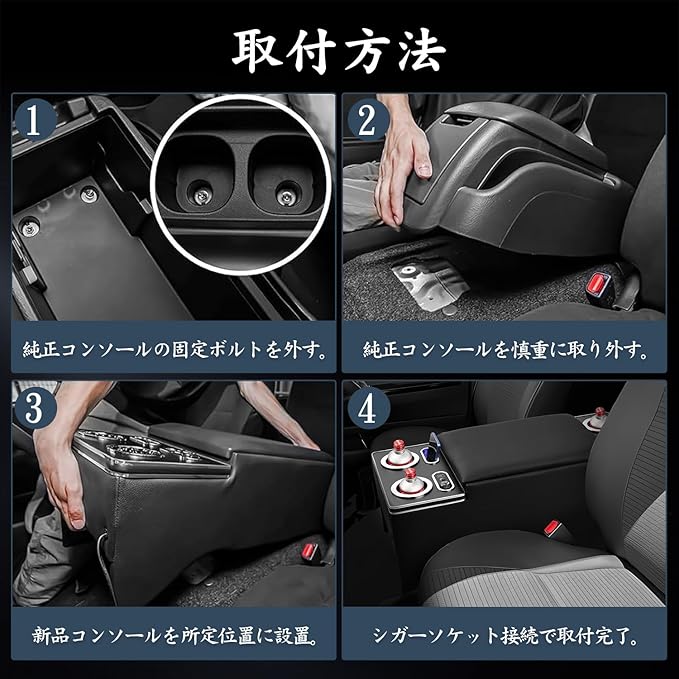 5.【取付方法】: 1.純正コンソールのボルト4本取り外す。2.純正コンソールを取り外す。3.商品を純正コンソールのあった場所に乗せる。4.シガーソケットを接続し、取り付け完了です。ご注意:製品の電力は12ボルト、24ワットです。製品の電力を超えないようにご注意ください。 また、本製品にはヒューズが搭載されており、充電や正常に点灯しなくなった場合に自分で交換することができます。もし、何か不明点がございましたら、いつでもお気軽にご連絡下さいませ。