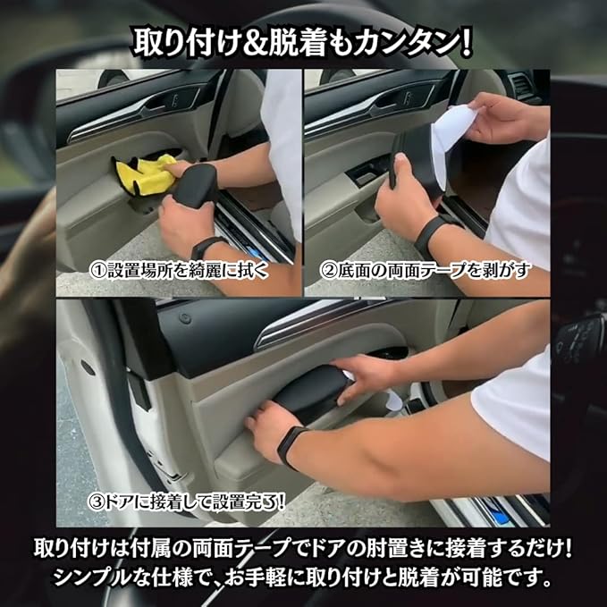 【取り付け&脱着もカンタン!】取り付けは付属の両面テープを商品底面に貼り付け、車のドアの肘置きに接着するだけ!シンプルな仕様で、お手軽に取り付けと脱着が可能です。※両面テープは商品内部に収納されております。