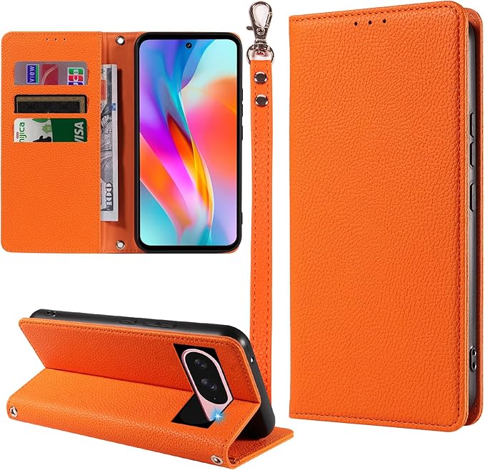 MINIKA Google pixel 10/10Pro 用 ケース 手帳型 ストラップ付き 高級レザー ピクセル10 ケース グーグルピクセル10 携帯カバー おしゃれ スマホケース カード収納 横置きスタンド機能 内蔵マグネット 開閉式 両面 360度 全面保護 耐衝撃 上質な手触り 擦り傷防止 汗や指紋防止 耐汚れ(オレンジ)