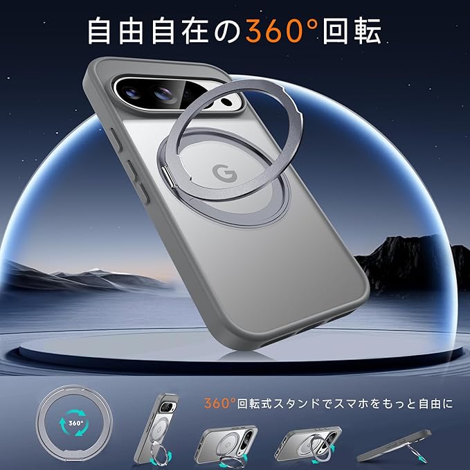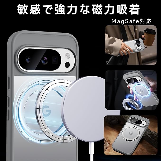 【米軍MIL規格・Magsafe対応】Google Pixel 10 Pro XL 用 ケース MagSafe対応 リング360 回転スタンド機能 縦横両対応 半透明 黄ばみ防止 ワイヤレス充電 レンズ保護 耐衝撃 携帯カバー 6.8 インチ マグネット搭載 車載ホルダー マグセーフ対応 おしゃれ (グレー)