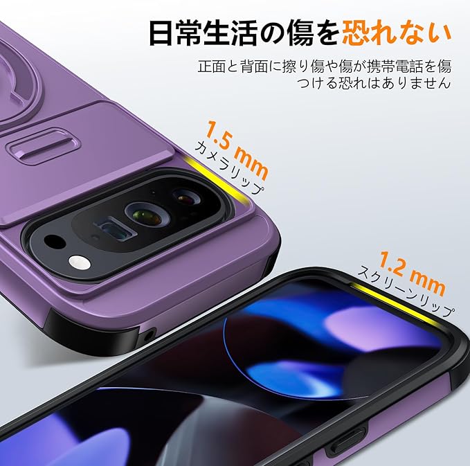 Google Pixel 10 Pro XL 用 ケース リング付き スライド式カメラカバー 隠しスタンド 耐衝撃 スタンド機能 縦横両対応 車載ホルダー PC TPUバンパー 防塵 人気 落下防止 滑り止め 指紋防止 ピクセル 10 プロ XL カバー 紫 MJJ-1065-10-04