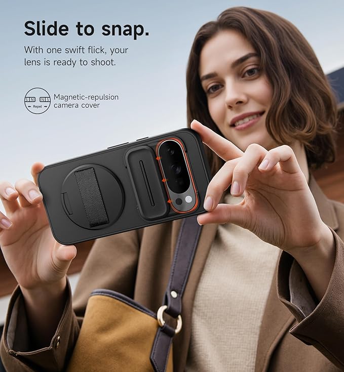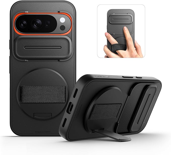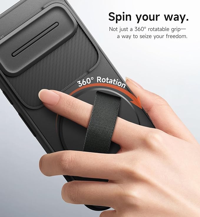 SURITCH 対応Google Pixel 10/10 Pro ケース 360 回転式ハンドストラップ スマホグリップホルダー & インビジブルキックスタンド & スライドカメラカバー付き 頑丈な耐衝撃保護カバー - ブラック