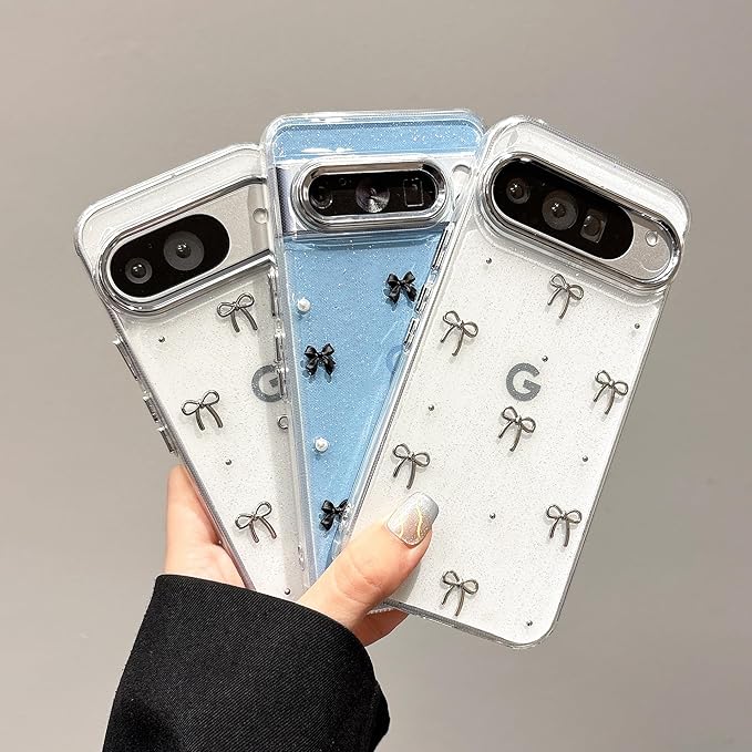 QLTYPRI Google Pixel 10 Pro XL 用 ケース クリア シルバー ミニリボン おしゃれ 韓国 透明 可愛い 耐衝撃 スマホケース 立体 りぼん装飾 きらきら ピクセル 10 Pro XL ケース 対応、シルバー