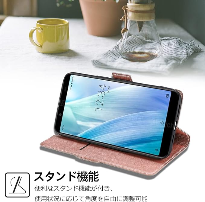 【特徴2】:スマホを横置きにしての視聴は不可欠なので、本ケースはスタンド機能が付きます。横向いて斜めに立てて両手を解放し、お気軽に読書やビデオの観賞を楽しむことができます。