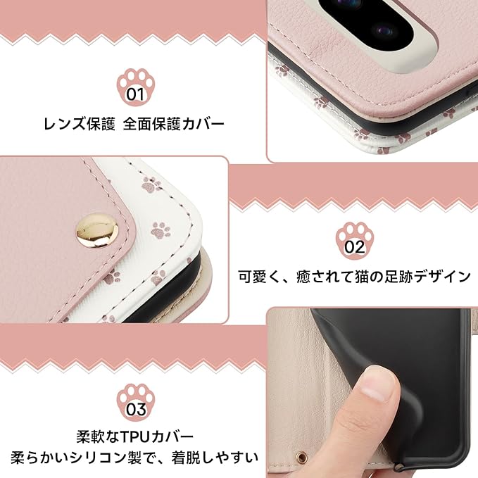 Google Pixel 10 ケース 手帳型 グーグル ピクセル 10 プロ ケース 可愛い 猫 足跡 ピクセル 9 Pro カバー 女性 マグネット式 Pixel9 スマホケース カード入れ収納 横置きスタンド機能 ぐーくるぴくせる10 PUレザー 衝撃吸収 軽量 全面保護 外側ポケット 防塵 擦り傷防止 シンプル 大人人気 6.3インチ (ピンク)