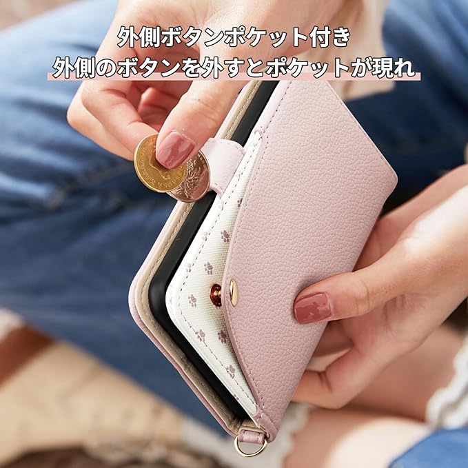 【外にもポケットあって便利】この便利なスマホケースは、外側のボタンを外すとポケットが現れます。 外側ポケットだどワンアクションでメモやレシートなど出し入れ出来てひと手間へりました。 スタイリッシュで洗練されたデザインは他のケースとは一線を画し、周囲からの注目を集めます。さらに、内側ポケットにはお札やカードなどの小物を収納することができ、使い勝手も抜群です。