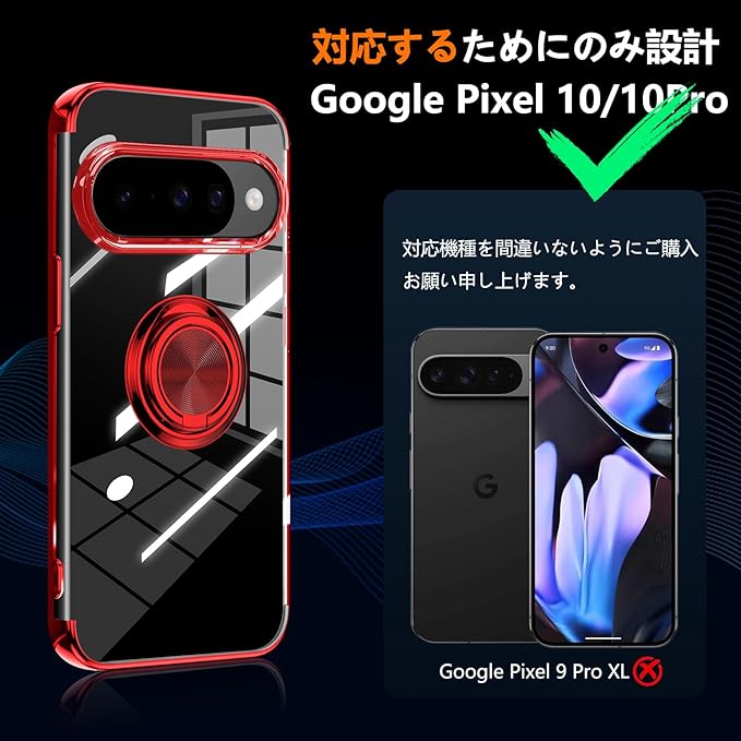 Google Pixel 10 用 ケース Pixel 10 Pro 用 ケース リング付き クリア 耐衝撃 スタンド機能 透明 TPU 車載ホルダー対応 落下防止 防塵 薄型 軽量 一体型 変形防止 保護カバー ピクセル 10/ピクセル 10 Pro 用 カバー 赤 W-YXZH-86-02