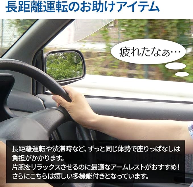 長距離運転のお助けアイテム/長距離運転や渋滞時など、ずっと同じ体勢で座りっぱなしは負担がかかります。片腕をリラックスさせるのに最適なアームレストがおすすめ!さらにこちらは嬉しい多機能付きとなっています。