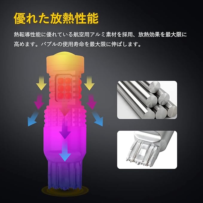 【放熱性&耐久性抜群】熱転導性能に優れている航空用アルミ素材を採用し、放熱効果を最大限に高めます。バルブ内部の精密な回路を熱からしっかりと守り、チップ性能を確保し、使用寿命を最大限伸ばすことができます。