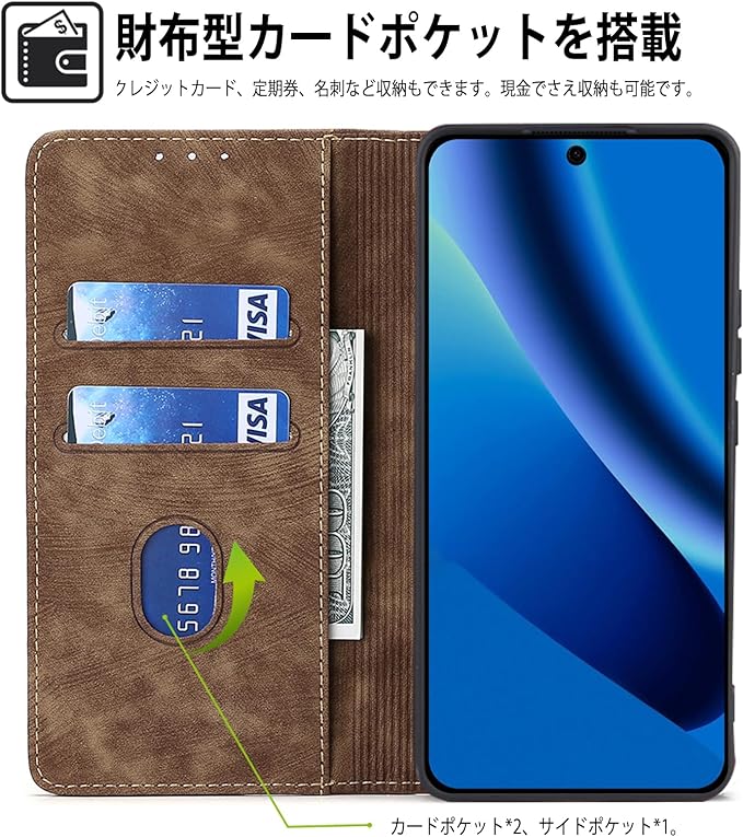 【実用的な機能】レトロなスタイルの手帳型ケースの外観はあなたの好みをよりよく反映し、ファッショナブルな生活を楽しむことができます。実用性が高くて、マグネット式のフリップで携帯をしっかりとカバーできだけではなく、ケースを装着したまま、音量ブボタン、カメラ、コネクターなどのを自由に使えます。車券、IDカード、名刺に便利な片側にカードスロット2つ、銀行券など挿入可能サイドポケット付き、ちょっとしたお出かけにもこれ一つでOK!あなたの人生をより便利にします。