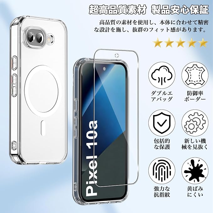 【1個+2枚セット】For Google Pixel 10a ケース(1個 MagSafe対応)+ガラスフィルム(2枚) Greerass 保護ケース クリア ガラスフィルム付き TPU+PC素材 MagSafe対応 耐衝撃 衝撃吸収 全面保護 カメラ保護 薄型 軽量 滑り止め 黄ばみ防止 指紋防止 透明 耐久 (クリア)