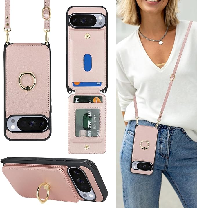 Cavor グーグルピクセル10/ 10 Proケース手帳型pixel10 ケース 手帳型ショルダーストラップクロスボディ肩掛け 首かけ 斜めがけ 背面ポケット付きPixel 10用のケース財布カバー【上下開】グーグルピクセル10proケースカード収納【RFID機能】case 360 回転リング横置磁気機能落下防止/持ちやすい-ピンク