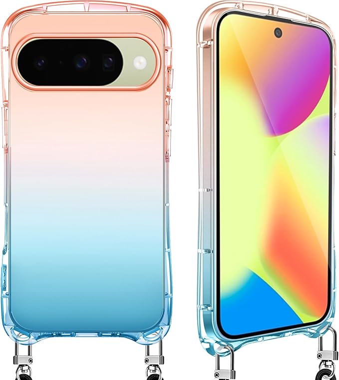 Google Pixel 10 用の ケース ショルダー ストラップ グラデーション Pixel 10 Pro 用の カバー 斜めかけ 肩掛け 韓国 ピクセル 10 / 10 Pro スマホケース ライトブルー/オレンジ