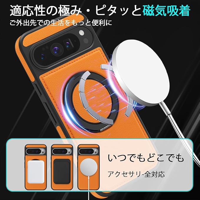 Google Pixel 10 Pro XL 用ケース Magnetic対応 リング付き 耐衝撃 レンズ保護 グーグル ピクセル 10 pro xl 用ケース マグネット搭載 360 回転 PC+PUレザー 衝撃吸収 スタンド機能 黄変防止 シンプル スマホカバー オレンジ J15-29