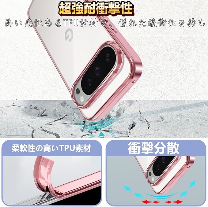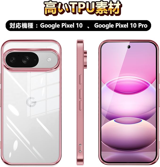 Google Pixel 10 / Pixel 10 Pro ケース クリア ソフトケース ドイツTPU素材採用 100MPa射出成形 真空電鍍フレーム 耐衝撃 黄ばみ防止 レンズ保護 薄型 軽量 カード・写真を挟める DIYデコ 通勤・デート・旅行・オフィス向け(ローズゴールド)