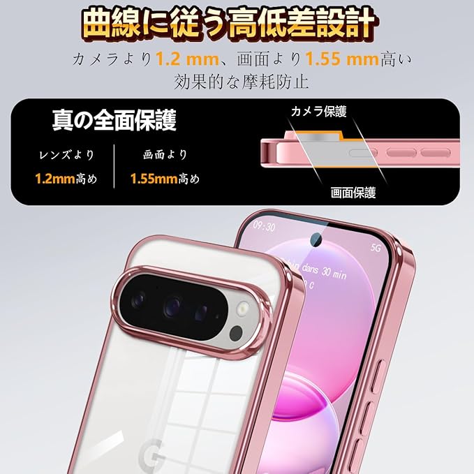 カメラ周りには約2mm高めの縁を設けたレンズ保護設計を採用し、机やテーブルに置いた際もレンズが直接触れにくく、傷や摩耗を防ぎます。透明で使いやすい グーグルピクセル10プロ ケース として、デザイン性だけでなく実用性にも配慮しました。