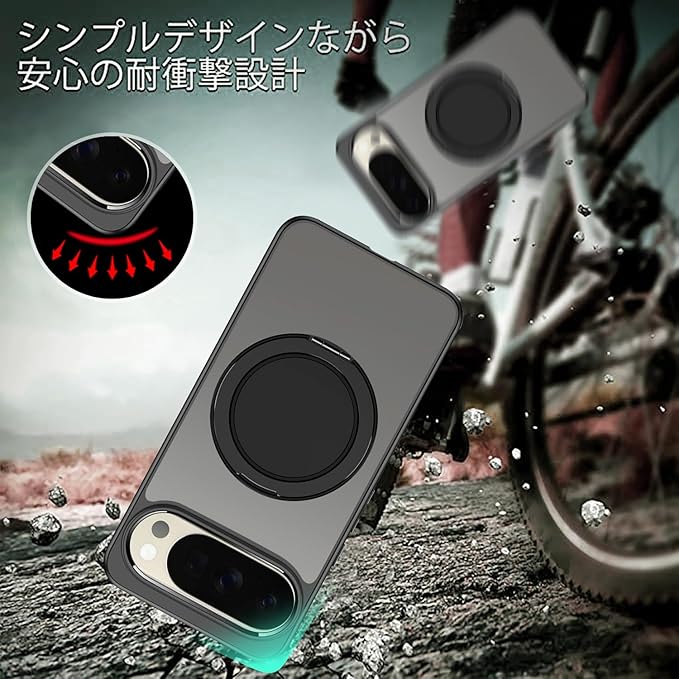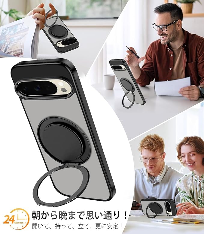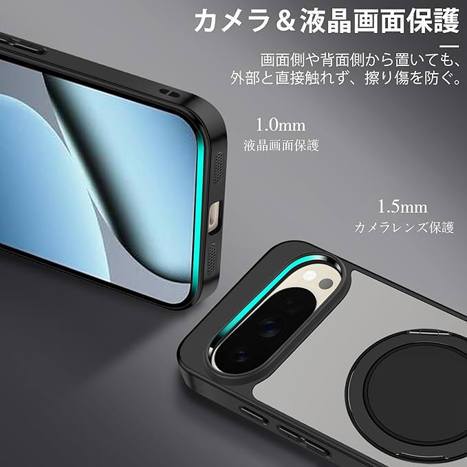 Pixel 10 Pro XL ケース 半クリア リング付き 360 回転スタンド MagSafe対応 ワイアレス充電対応 耐衝撃 ピクセル 10Pro XL カバー 薄型 軽量 人気 pixel 10 pro xl スマホケース 半透明 PC 車載ホルダー対応 (ブラック)