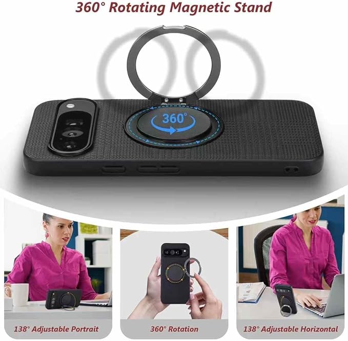 360度回転式スタンドリングは、任意の角度調整が可能。マグネット式のため、カードケースやスマホスタンド、車載スマホホルダーなどのアクセサリーを自由自在に付ける事ができます。