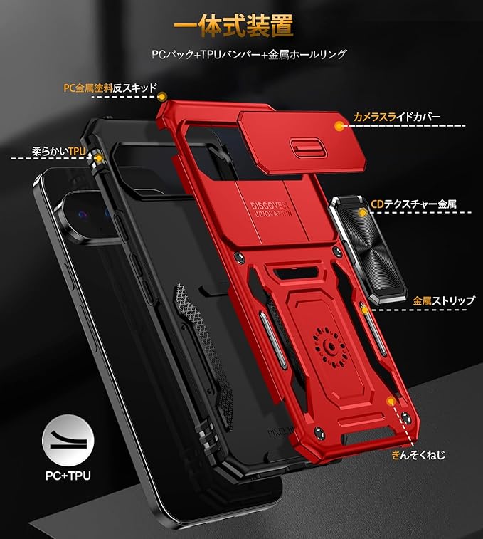 Google Pixel 10/10 Pro 対応 ケース リング付き スライド式カメラカバー 耐衝撃 スタンド機能 車載ホルダー レンズ保護 ピクセル10/10 プロ 対応 スマホケース PC TPUバンパー 防塵 人気 落下防止 滑り止め 指紋防止 携帯カバー 赤 K355