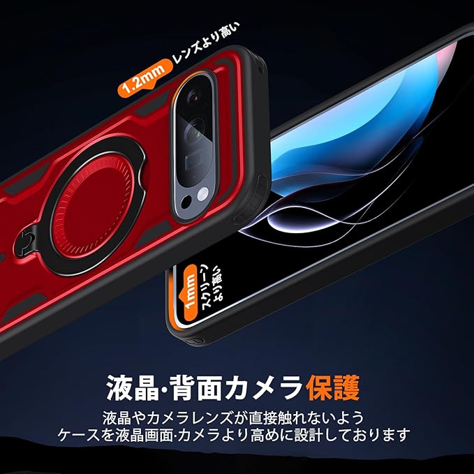 対応 Google Pixel 10 Pro XL 用 ケース リング付き 隠しスタンド ピクセル 10 プロ XL カバー 耐衝撃 縦横両対応 マグネット搭載 360度回転スタンド 車載ホルダー ワイヤレス充電 携帯カバー 赤 Q-TH-GP10PXL-02