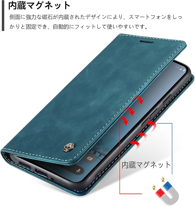「財布型カード収納」このスマホケースには、2つのカードスロットと内ポケットが付いています。カードスロットは、交通系パスやクレジットカードなど、頻繁に使用するカードの収納に最適で、内ポケットには少額の現金や名刺を収納できます。地下鉄での通勤やショッピングなど、移動をシンプルかつ効率的に行えます。ケースは強力なマグネット留め具を採用しており、開け閉めが簡単で、片手で簡単に操作できます。