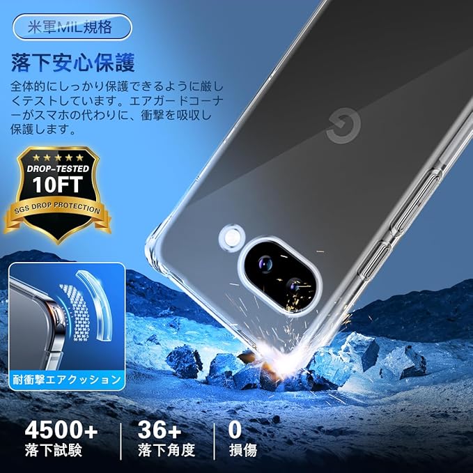 【米軍MIL規格 耐衝撃性!】いくら気をつけていても落としてしまうことがある!でも大丈夫!ケースは米国防総省が制定する米軍 MIL 規格に準拠しており、どんな激しい衝撃にも耐え、スマホを確実に守る強力な保護力を誇ります。頑強なバリアを築き上げており、対応 グーグルピクセル10a をあらゆる衝撃から完全に守り抜くために生まれた優れた製品です。