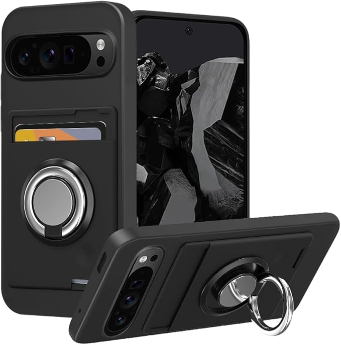 For Google Pixel 9 / Google Pixel 9 Pro ケース リング付き シリコン カード収納 グーグルピクセル9/9 Pro スマホケース スタンド機能 360 回転リング 耐久 滑り止め 黑