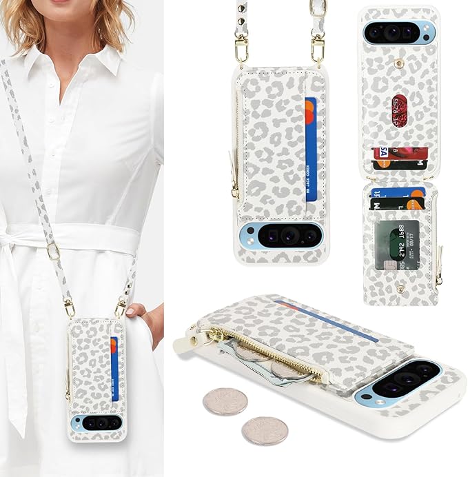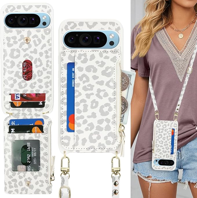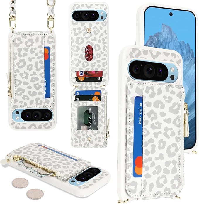 for Google Pixel 9Pro XL ケース for Pixel 9 Pro XL ショルダー リング付き 手帳型 上下開 CASE カバーSunYoo カード収納 横置き スタント肩がけ 首掛け 斜め掛け ファスナー ストラップ付き ショルダーケース 豹柄 ヒョウ柄 ホワイト