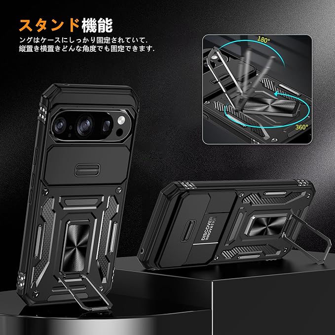 対応 Google Pixel 10 用ケース Pixel 10 Pro 用ケース リング付き スライド式カメラカバー 衝撃吸収 耐衝撃 一体型落下防止 スタンド機能 PC+TPU 二重構造 防塵 薄型 軽量 360度回転 保護携帯カバー 黒 MJJ-1064-09-01