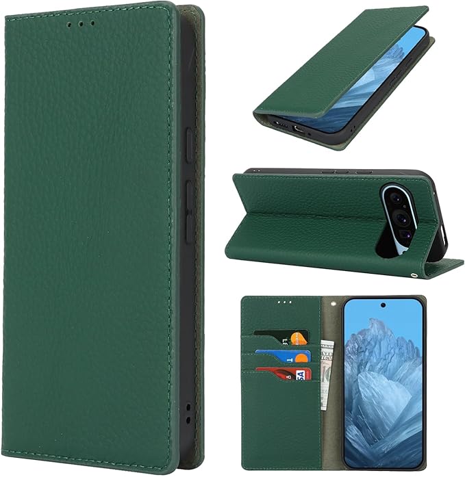 Pelanty for Google Pixel 9 Pro XL ケース手帳型 スマホケース 牛革製品 本革レザー 財布型カバー カード収納 スタンド機能 内蔵マグネット 手作り柔らかい グーグル ピクセル9pro XL 携帯カバー ストラップ付 ヘッドフォンケーブル 耐衝撃 グリーン