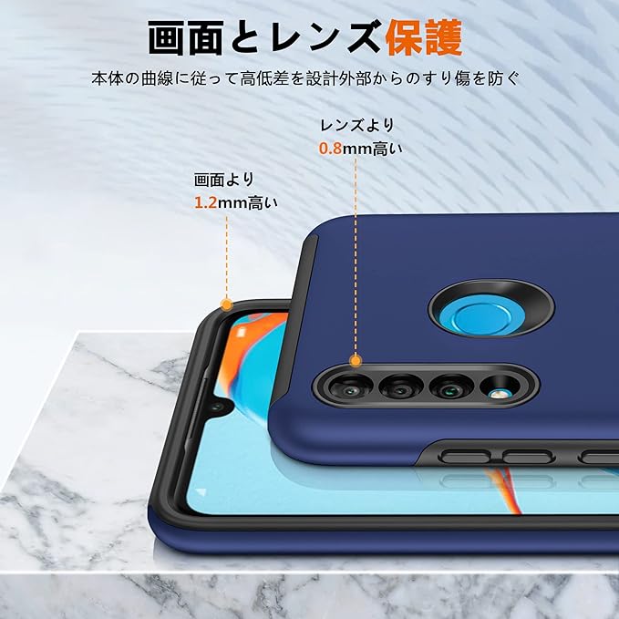 【全面保護】ソフトなTPU(シリコン)とハードなPC(ポリカーボネート)を組み合わせた2重構造方式です。フチが高低差を設計し、液晶画面とカメラレンズをキズから保護します。品質のTPUを採用し、携帯電話の落下時に受けた衝撃力を分散させ、携帯電話を有効に保護する。柔らかい素材のため、着脱も簡単で、スマホ本体への擦り傷も心配無用です。