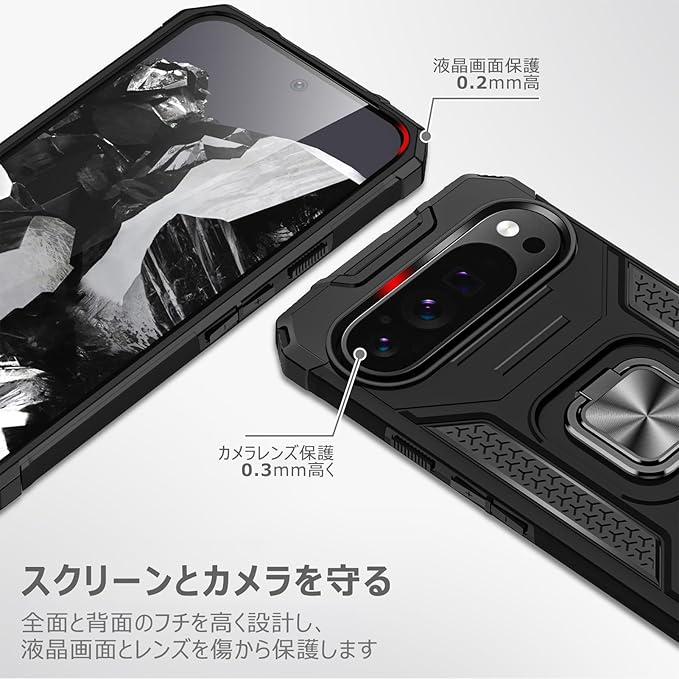 Google Pixel 9 Pro/Pixel 9 用のケース リング 衝撃吸収 耐衝撃 TPU+PCバンパー 二重構造 米軍MIL規格 全面保護 滑り防止 車載ホルダー対応 擦り傷防止 滑り止め 軽量 薄型 グーグル ピクセル 9/9 pro 用のカバー 6.3インチ 指紋防止 耐久 おしゃれ 人気 携帯カバー 黒 MZ64-156