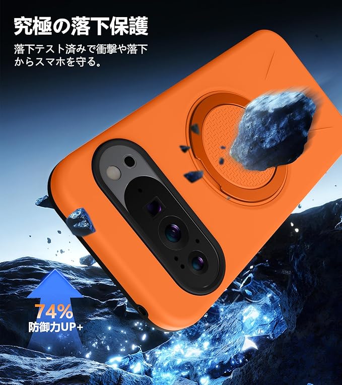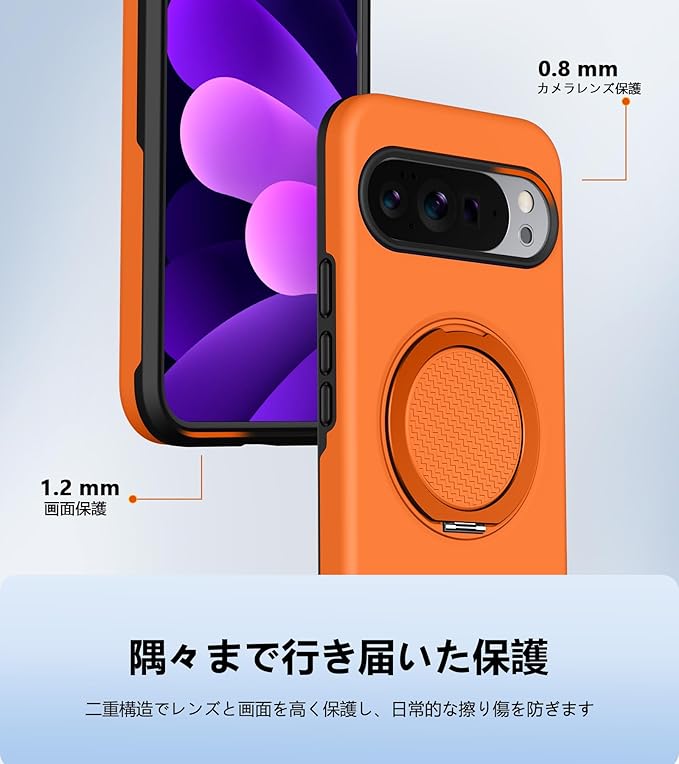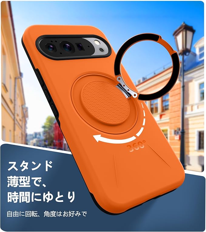 と互換性のある Google Pixel 10 Pro XL 用の ケース Magnetic対応 スタンド付き リング付き 耐衝撃 縦横両可能 360 自由回転 TPU+PC 軽量 滑り止め 落下保護 スタンド機能 車載ホルダー対応 ピクセル 10 プロ XL 携帯カバー オレンジ R-KP-GP10PXL-04