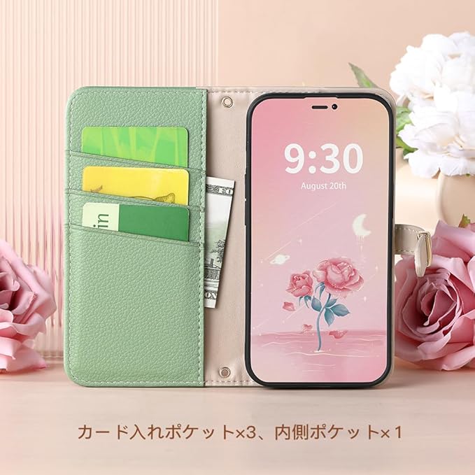 【カードポケット付き】スマホケース 手帳型財布型:ブック型ケースとして、裏側に三つのカードポケットとお札入れのフリーポケット一つあり、ショップでのポイントカード、カード類や紙幣、名刺や定期券、免許証、交通機関でのスムーズな移動をサポートでき、 SUICA / PASMO / ポイントカード / メモ 等収納でき