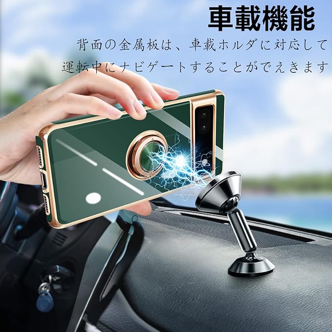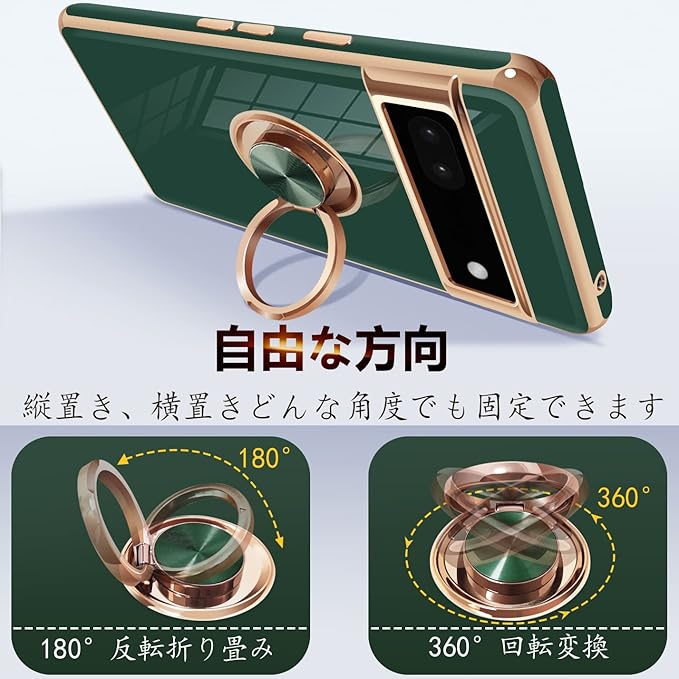 に適合するGoogle Pixel6A 用のケース リング付き グーグル ピクセル 6A 用のリング カバー 耐衝撃 TPU メッキ加工 360 回転 スタンド機能 車載ホルダー ストラップホール付き(ダークグリーン)