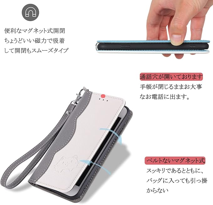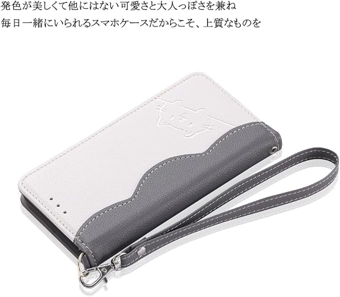 【ストラップ付き】ストラップ付き、持ち運びが便利でアクセサリーとしてもオススメです。さらに、使いやすいために、左上に金具と左下にストラップ穴がついています。好きなストラップをつけられます。【マグネット式】さらに、マグネットは内臓に配置され、磁気カードに影響がほとんどありません。カバーの開閉は便利で片手で操作可能です。 【スタンド機能】スマホ横置きでスタンド機能も付き、好きな角度を調節できて、両手が解放され、通勤・通学などの移動、新幹線や飛行機での長期距離移動など、お好みの角度で動画視聴などを楽しめます。