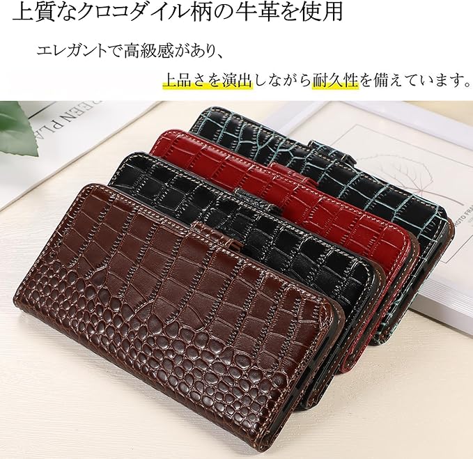 【素材】高級牛革素材・質感・縫製全てに高級感が漂う作り。手に取ると必ずご理解頂けます。キメの細かく滑らかな手触りのクロコダイルエンボスレザー。本体(外側) : 牛革(牛皮をクロムなめしした皮革)にホログラムとクロコダイル模様を転写した皮革 カードポケット : フルグレインレザー(牛皮革) 本体(内側) : シャムード(人工スエード) 内側ケース : ソフトなTPU