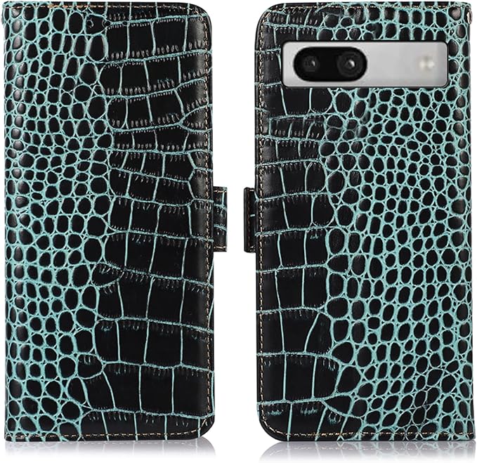 for Google Pixel 7a ケース 手帳型 本革 ワニ柄 for グーグ ルピクセル 7a 牛革 財布型 鰐柄 クロコダイル柄 耐衝撃 [RFIDブロッキング] カード収納 マグネット式ボタン 横置きスタンド機能 便利 財布型携帯 スマホケース 水色 Rureu, Eyu-7a-green