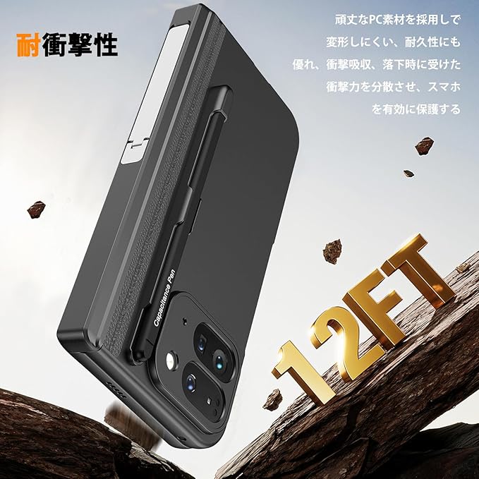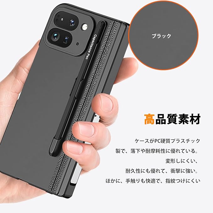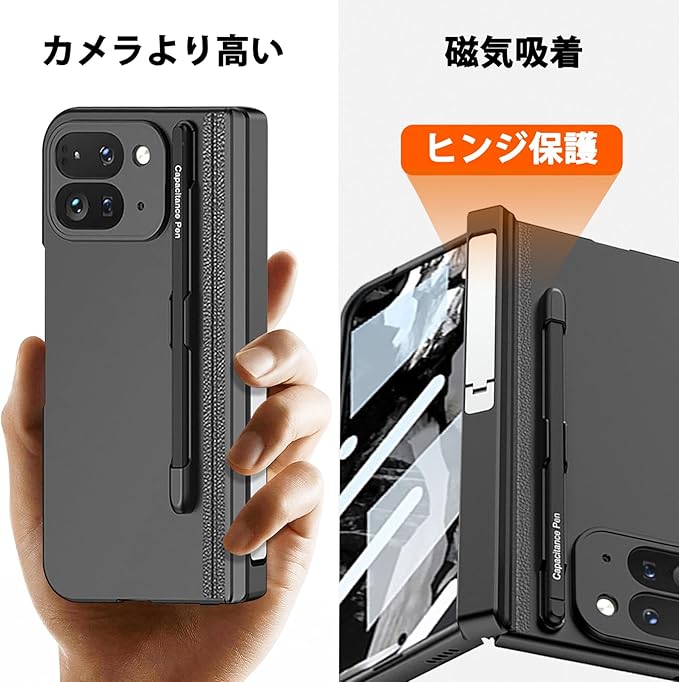 NINKI適応 Google Pixel 9 Pro Fold ケース ペン付き ペン収納 キックスタンド 磁気ヒンジ 折り畳み式 PC スクリーンフィルム一体型 ヒンジ保護 すり傷防止 ワイヤレス充電 グーグル ピクセル 9プロ フォールド 5G スマホ 保護ケースカバー(ブラック)