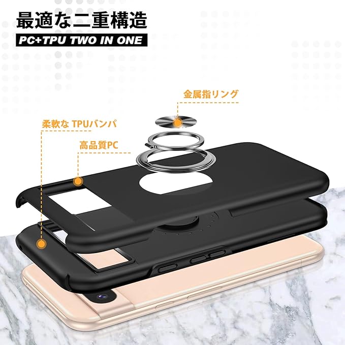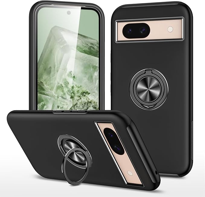 対応 Google Pixel 8 用の ケース リング 耐衝撃 米軍MIL規格取得 TPU+PC 衝撃吸収 カバー レンズ保護 リングつき 指紋防止 360 回転 車載ホルダー対応 スタンド機能 防塵 薄型 落下防止 擦り傷防止携帯電話カバー 黒C85-APixel8-01