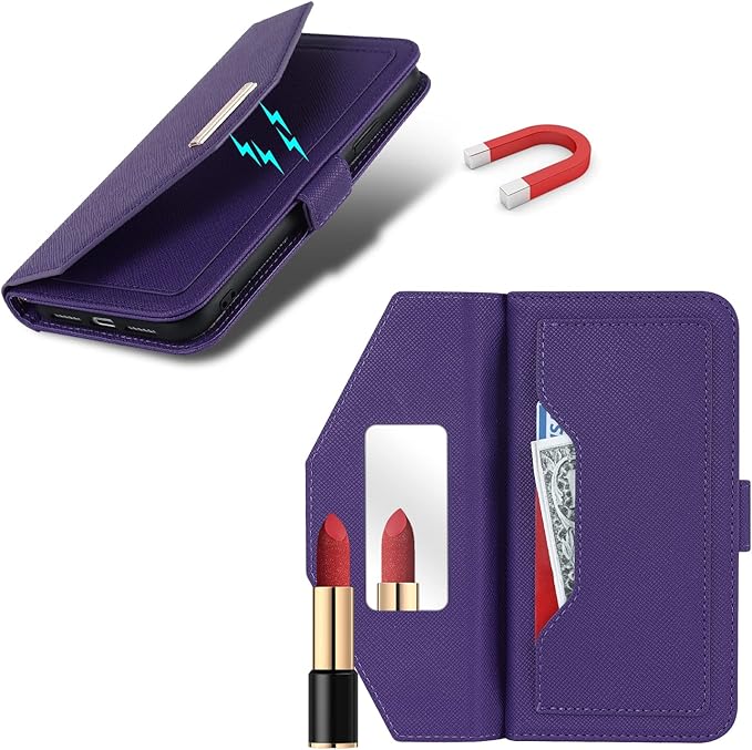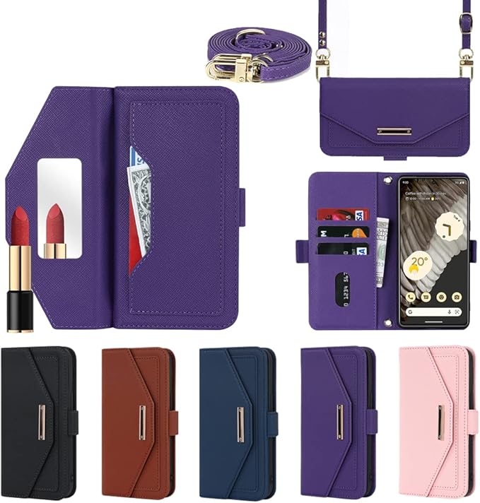 Eastwave for Google Pixel 7 Pro ケース for Pixel7 Pro 縄掛けカバー 手帳型 手帳 for pixel 7pro case チェック柄 鏡 ミラー付き 長ストラップ付き 肩掛け 革レザー 柔らかいTPU 多機能 財布型 カード収納 小銭入 れ スタンド機能 全面保護 5色パープル