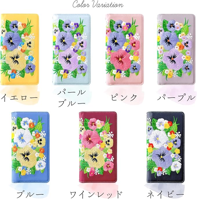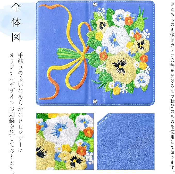 【パンジーの花束をフェルト刺繍した華やかな手帳型ケース】印刷ではなく実際に刺しゅうを施しているため、刺繍の部分が若干膨らんでいる場合がございますが、不良品ではございませんので、予めご了承ください。開閉部分にマグネットを内蔵しておりますが、磁器エラーを防ぐために磁器を弱めにしております。カチッと留まるほどではございませんので、予めご了承ください。