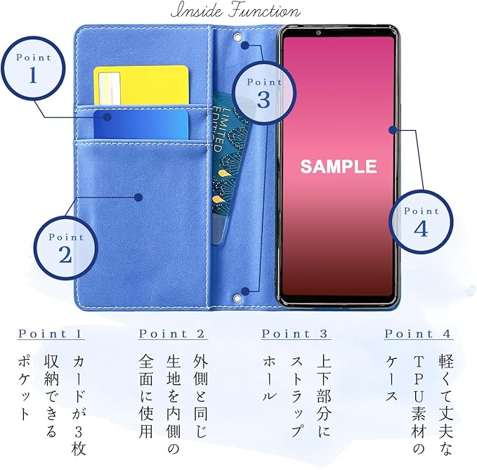 【内側黒TPU】本体をはめるTPUケースは機種により電源、サイドボタンの穴が開いておらずケースの上から押していただく仕様になっております。手帳部分とケース部分は接着しておりますが、強くめくると剥がれる場合がございます。