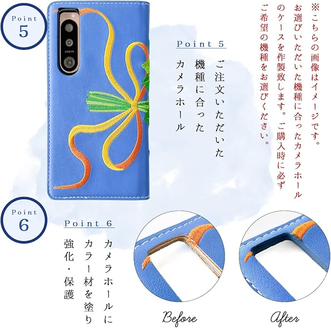手触りの良いなめらかなPUレザーを使用しております。カメラ・指紋認証の開口部には1点ずつ手作業で丁寧にカラー材を塗って、コーティングしております。ストラップ穴があるため、様々なアレンジが可能となります。機種によってカメラ穴や指紋認証の開口部は異なります。
